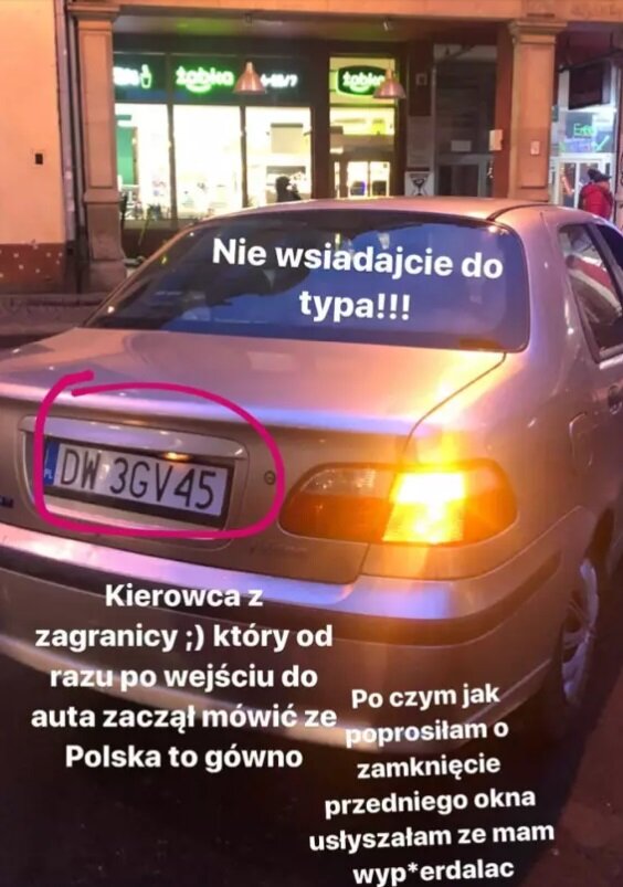 Gąsiewska opublikowała zdjęcie auta, zwracając uwagę na tablice rejestracyjne. Jak się okazało, aktorka wsiadła do taksówki, gdy kierowca zaczął mówić brzydkie słowa dotyczące takiego kraju, jak Polska. Wiadomo, że mężczyzna pochodzi z zagranicy. Młoda aktorka nie mogła to pozostawić bez uwagi, dlatego na jej Instagram, widzimy krótki wpis o tym: