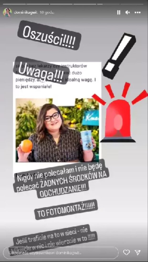 Nigdy nie polecałam i nie będę polecać żadnych środków na odchudzanie. To fotomontaż. Jeśli traficie na to w sieci nie klikajcie w nic – alrmuje fanów.