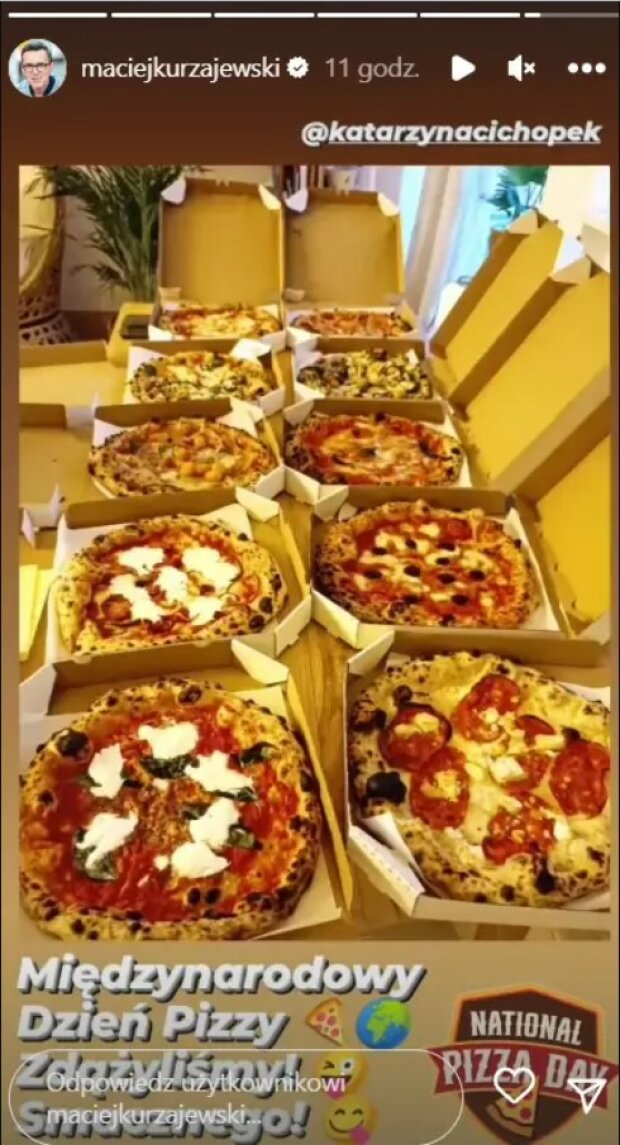 Międzynarodowy Dzień Pizzy. Zdążyliśmy! Smacznego! – napisał pod kadrem, dając do zrozumienia, że taki dobór menu nie był przypadkowy.
