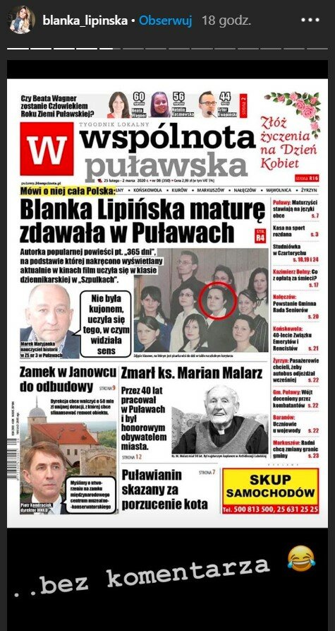 W Na swoim Instastories, pisarka podzieliła się zdjęciem gazety Puławskiej, na którym można zobaczyć gwiazdę jeszcze w liceum.
