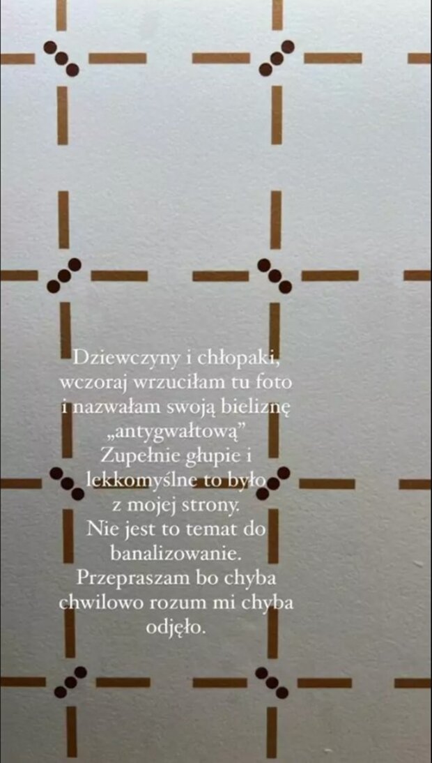 Dziewczyny i chłopaki, wczoraj wrzuciłam tu foto i nazwałam swoją bieliznę antygwałtową. Zupełnie głupie i lekkomyślne to było z mojej strony. Nie jest to temat do banalizowania. Przepraszam, bo chyba chwilowo mi chyba rozum odjęło – napisała.