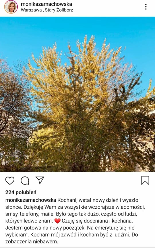 Wydaje się jednak, że sama Monika nie spodziewała się takiego obrotu spraw i nie była na to przygotowana. Na szczęście dziennikarka nie poddaje się i zamierza podejmować nowe wyzwania. "Kochani, wstał nowy dzień i wyszło słońce. Dziękuję Wam za wszystkie wczorajsze wiadomości, smsy, telefony, maile. Było tego tak dużo, często od ludzi, których ledwo znam. Czuję się doceniana i kochana. Jestem gotowa na nowy początek. Na emeryturę się nie wybieram. Kocham mój zawód i kocham być z ludźmi. Do zobaczenia niebawem" – czytamy na jej Instagramowym profilu pod zdjęciem drzewa.