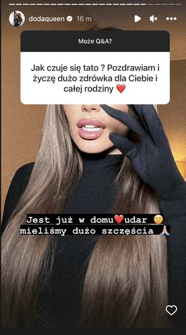 Czym ja się przejmuję bez sensu? To tylko ciuchy. (...) Ważniejsze są inne problemy. Ojciec w szpitalu. Trzeba się zająć poważnymi rzeczami – napisała Doda na swoim Instastories.