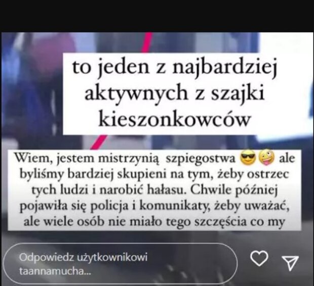 Okazało się, że nie krzyczeli do nas, tylko do dziewczyny, która szła za nami, a nie chcieli jej w przedziale, ponieważ zorientowali się, że to jest szajka kieszonkowców. Dziewczyna miała już rękę w mojej torbie. W geście obrony pokazała, że niczego nie ma w rękach i pokazała ręce do góry. Szybko się wycofała, zanim jeszcze zdążyliśmy się zorientować – dodała.
