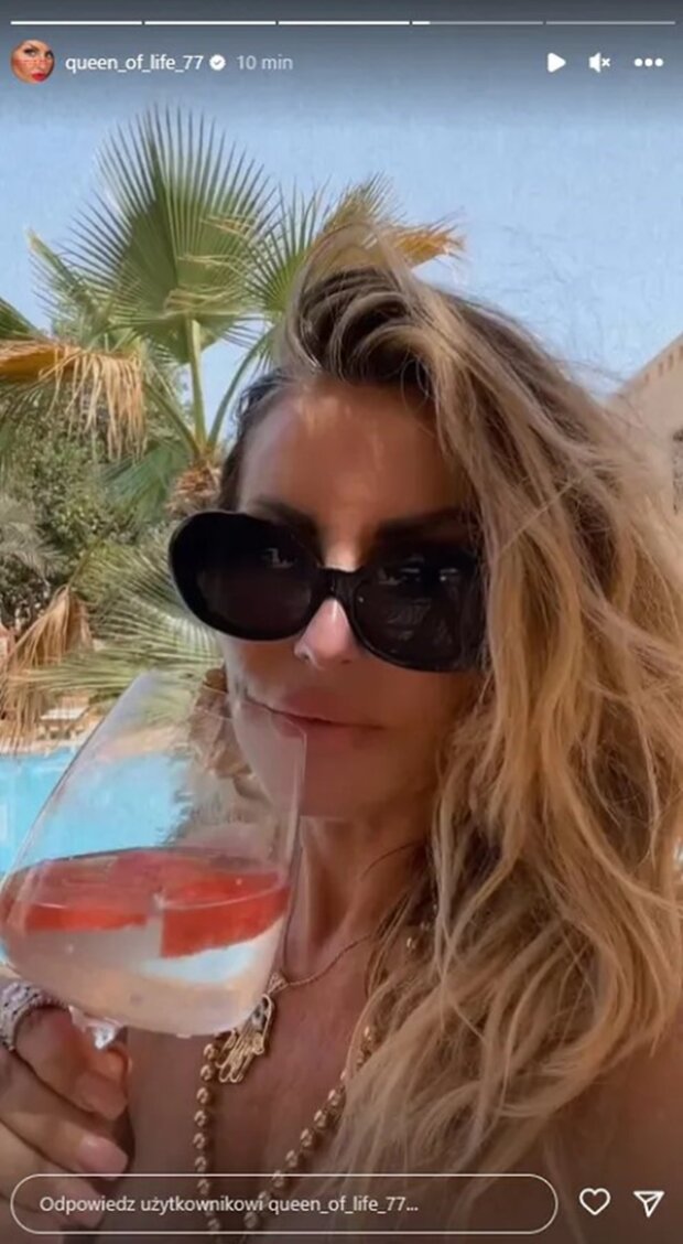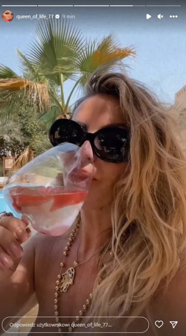 Na zdjęciach i filmach udostępnionych w mediach społecznościowych można zobaczyć, jak celebrytka delektuje się orzeźwiającymi napojami nad basenem i chwyta promienie słońca.