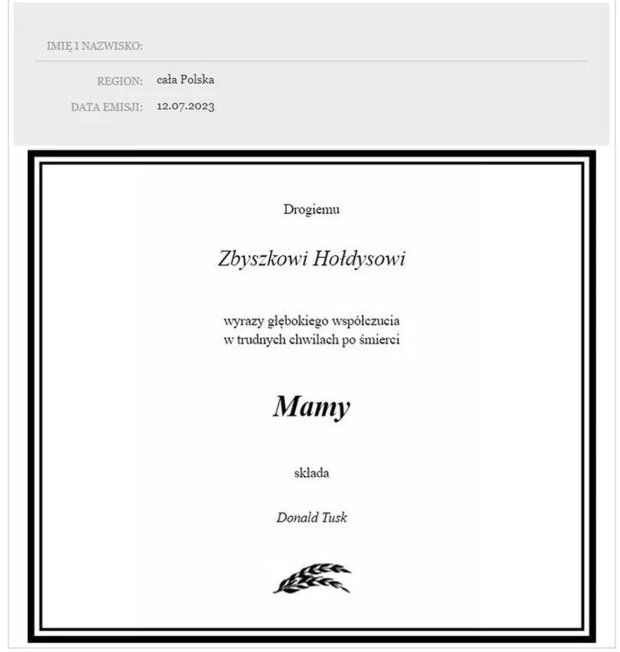 Drogiemu Zbyszkowi Hołdysowi wyrazy głębokiego współczucia w trudnych chwilach po śmierci Mamy składa Donald Tusk - czytamy w nekrologu.