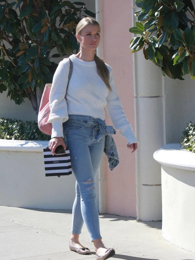Uważne oko obiektywu uchwyciło każdy nawet najmniejszy detal stylizacji gwiazdy. Począwszy od pudrowych balerinek, skończywszy na masywnym pierścionku zaręczynowym z diamentem oraz obrączką wysadzaną diamentami.