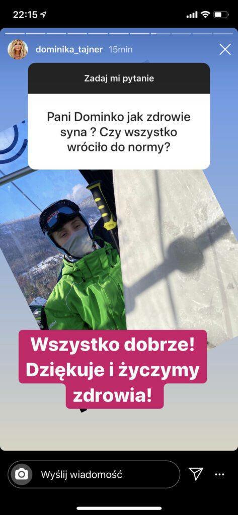 W tym czasie cała Polska martwiła się o zdrowie chłopaka. Jak się teraz czuje? Dominika Tajner na swoim InstaStories zamieściła zdjecie szczęśliwego syna, stan zdrowia którego już jest lepszy. Jeden z obserwatorów Tajner zapytała ją: