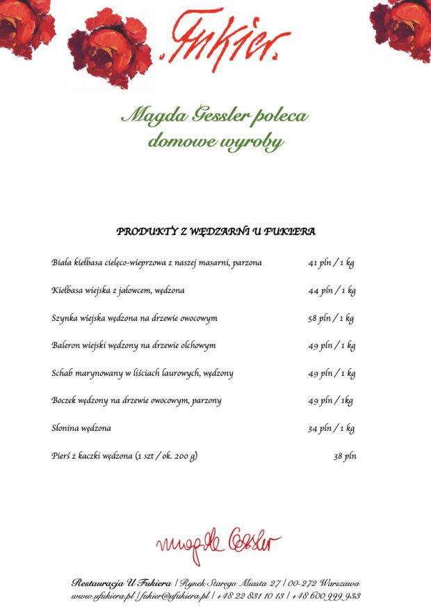 Drodzy Goście, nie możemy dla was gotować, karmić was i gościć w naszej restauracji, co nas bardzo smuci. Życie nie lubi próżni, dlatego specjalnie dla was uruchamiamy wędzarnię U Fukiera! Tego jeszcze nie było! Nasze własne wyroby, najlepszej jakości mięso, wyjątkowe receptury Magdy Gessler i Szefa Kuchni Patryka Burnickiego, przygotowane z miłością, niezwykłą starannością i sterylnością. Całkowicie naturalne, bez ulepszaczy smaku. Rozkoszujcie się niezwykłym smakiem domowych wyrobów. Już przyjmujemy zamówienia na wielkanocne święta