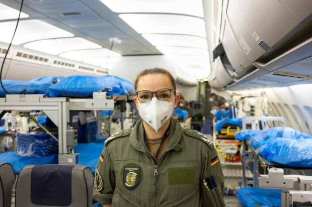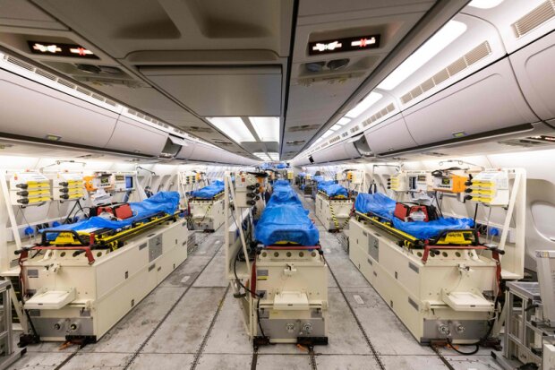 Na zdjęciu pokazane jest wnętrze samolotu, którym do kliniki w Niemczech transportowani są pacjenci z Włoch.