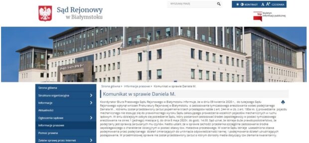 Koordynator Biura Prasowego Sądu Rejonowego w Białymstoku informuje, że w dniu 09 kwietnia 2020 r., do tutejszego Sądu Rejonowego wpłynął wniosek Prokuratury Rejonowej w Białymstoku o zastosowanie tymczasowego aresztowania wobec podejrzanego Daniela M. , któremu został przedstawiony zarzut popełnienia trzech przestępstw każde z art. 244 kk w zb. z art. 180a kk. tj prowadzenia pojazdu mechanicznego nie stosując się do prawomocnego wyroku Sądu zakazującego prowadzenia wszelkich pojazdów mechanicznych w ruchu lądowym. W dniu dzisiejszym odbyło się posiedzenie Sądu, który postanowił zastosować środek zapobiegawczy w postaci tymczasowego aresztowania na okres 1 (jednego) miesiąca tj. do dnia 8 maja 2020 r, do godz. 14.00. Sąd uznał, że istnieje duże prawdopodobieństwo, że podejrzany jest sprawcą zarzucanych mu czynów. Nadto ustalił, że w sprawie zachodzi przesłanka szczególna zastosowania środka zapobiegawczego o charakterze izolacyjnym w postaci obawy tzw. matactwa procesowego. W ocenie Sądu istnieje uzasadniona obawa podejmowania przez podejrzanego działań zmierzających do uniknięcia odpowiedzialności karnej i podejmowania działań utrudniających postępowanie - możemy przeczytać w komunikacie sądu.