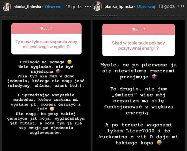 Już nie dla kogo nie jest tajemnicą, że Lipińska kilka lat wcześniej wyglądała zupełnie inaczej. Ważyła 84 kilogramy przy 160 centymetrach wzrostu. W jakimś momencie gwiazda postanowiła całkowicie zmienić swój wygląd. Zrzuciła kilka kilogramów, a potem zmieniło się nie tylko jej ciało, ale i życie. Co takiego zrobiła? Okazuje się, że autorka 365 dni używa dietę pozbawioną węglowodanów. Na swoim InstaStories jedna z fanek zapytała ją, skąd ma w sobie tyle samozaparcia. Lipińska wyjaśnia: