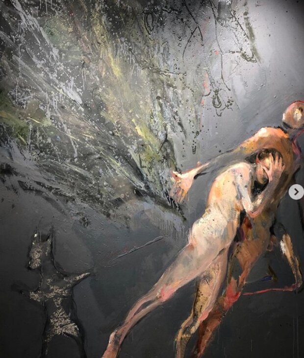 Wypędzenie z raju gdzie Jofiel bardziej przypomina wilka niż anioła namalowałem z pomocą Agnieszki, która w nieregularnym kleksie odkryła siłę natury grożącej nam ognistym mieczem albo raczej patykiem. Obecny czas budzi refleksję i pozwala na nowo go zinterpretować. To natura wypędza nas z edenu to świerki niczym grom z jasnego nieba kłują nasze gołe zadki a śmieszny wilczko-stworek może być mikroskopijnym wirusem,który ponownie uczy nas pokory @aga_wozniak_starak -podpisał swoje zdjęcie artysta.