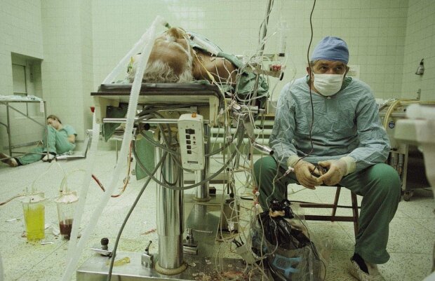 Widzimy na nim profesora Zbigniewa Religę, po blisko 23 godzinnej operacji przeszczepu serca. W rogu sali operacyjnej śpi asystent profesora., a na stole po udanej operacji wśród plątaniny kabli lezy pacjent Tadeusz Żytkiewicz.
