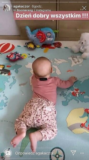 W porannej relacji na Instagram Aga podzieliła się zdjęciem, gdzie mała Emilia łeżąc na podłodze bawiła się swoimi zabawkami. Twarz dziewczynki nie widać, natomiast bardzo dobrze widać jaka ona jest energiczna i miła. Dziecko leży na blękitnym dywaniku, wokół różne dziecięce zabawki: słonik, miś, maskotki. Pokój sprawia wrażenie bardzo przytulnego i jasnego.