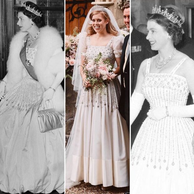 Księżniczka Beatrice zrezygnowała z niemodnych już rękawiczek ślubnych, usunęła część materiału spódnicy i dorobiła rękawki do sukienki swojej babci. Oprócz tego do diamentowej tiary dobrała także delikatny welon.