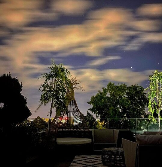 Taras piękny, ale i niebo też. Pędzące chmury i gwiazdy, Na takim tarasie to i lato w mieście może być cudowne, Magiczne miejsce, Ma pani obłędy taras