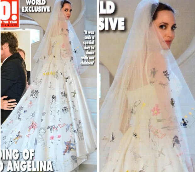 Bez wątpienia ta suknia jest niepowtarzalna. Suknia zaprojektowana przez dom mody Versace jest na pozór po prostu piękną suknią, jednak gdy zobaczymy jej ogromny welon - naszym oczom ukażą się zabawne grafiki. Co to takiego? To obrazki dzieci Angeliny, które wykorzystano jako ozdoby sukni aktorki. Świetny pomysł, prawda?