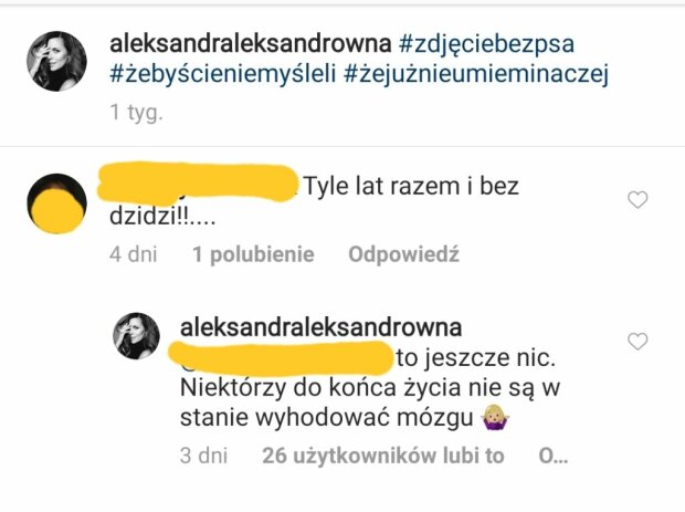 Pod zdjęciem pojawił się jeden komentarz, który się bardzo nie spodobał Kwaśniewskiej. Hejterka dotknęła możliwie nie zbyt przyjemny temat dla samej Aleksandry. Między innymi zapytała o to, dlaczego para nadal niema dzieci.