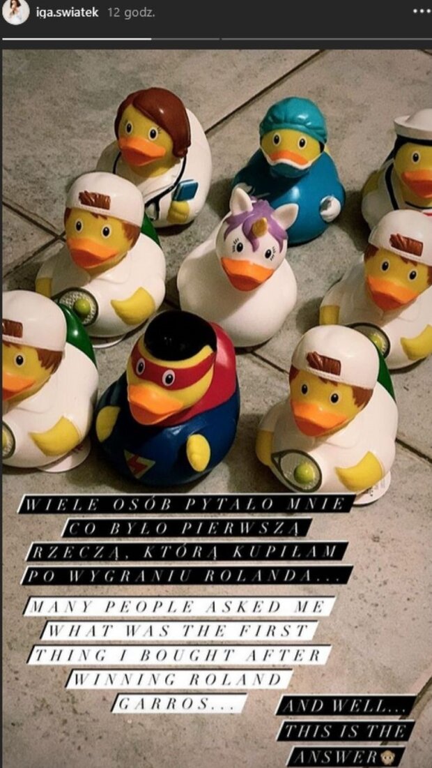 Przed zawodami, kiedy dziennikarze pytali ją na co przeznaczyłaby ewentualną wygraną wspominała, że marzy o jachcie. Jak się okazało po zwycięstwie Iga poszła na zakupy, jednak zdecydowała się na coś dużo skromniejszego. Sprawiło jej to sporo radości, bowiem tenisistka powiększyła właśnie swoją kolekcje!