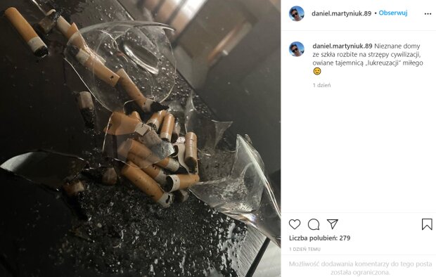 Kolejny post Martyniuka wskazał, że noc z Faustyną musiała być niezwykle ciekawa, bowiem tym razem dodał na Instagram zdjęcie petów i zbitego kieliszka, do którego dotał iście poetycki opis.