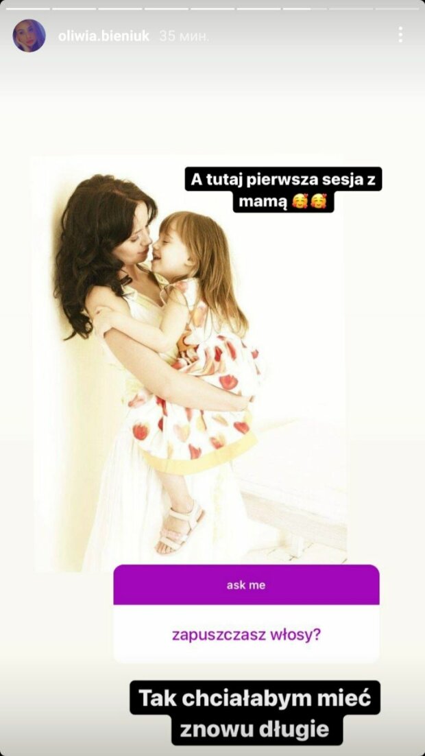 Dziewczynka jest bardzo aktywna na Instagramie. Ostatnio na Insta Story otrzymywała różne pytania od swoich internautów. Jeden z pytań zabrzmiał tak: Zapuszczasz włosy? Oliwia napisała, że tak chciałabym mieć znowu długie. W tym wrzuciła pierwszą sesję zdjęciową ze swoją matką Anną Przybylską. Na fotografii widzimy, jak aktorka trzyma w ramionach jeszcze małą Oliwię. Zdjęcie jest naprawdę niesamowite!