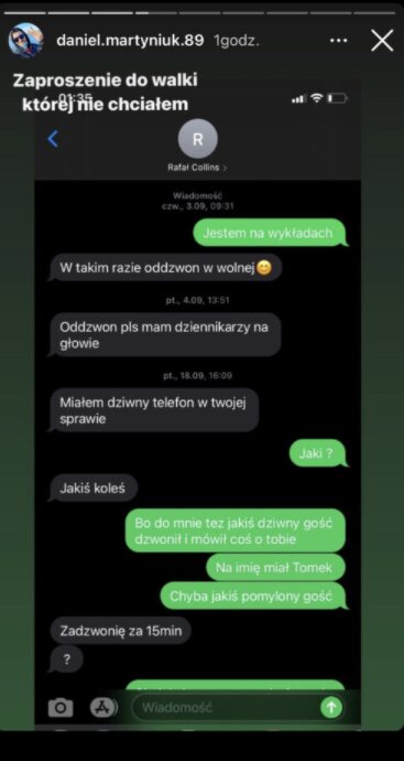 Z wiadomości wynika, że Rafał prosił Daniela o to, by do niego zadzwonił, być może w kwestii walki na Fame MMA, do której zostali zaproszeni przez tajemniczego Tomka.