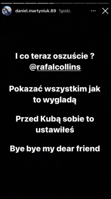 Jednak na plotkach o tejże walce poprzestano. Jednak wczoraj Daniel Martyniuk odświeżył na swoim Instagramie konflikt z Collinsem. Najpierw nazwał gwiazdę TVN-u oszustem, a potem pokazał on screen wiadomości, którą podobno dostał od swojego wroga kilka dni po tym, jak publicznie zaczął się ich konflikt.