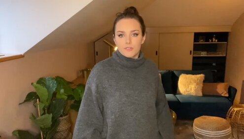 W tle bowiem możemy zobaczyć salon lub biuro wokalistki. Co w nim się znajduje? Na pierwszym planie widać piękną sofę z wygodnymi poduchami. Nie brakuje też roślin! Jest ładnie i przytulnie.