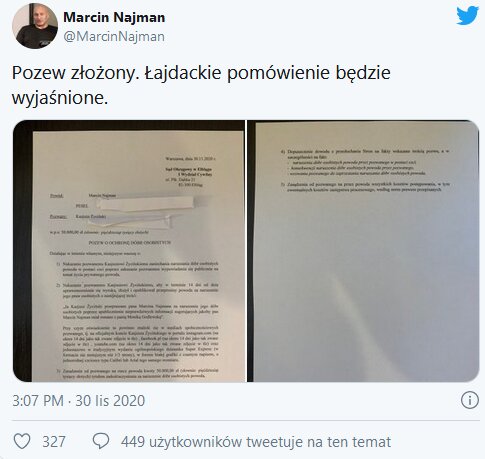 Powiedział to, nie mając na to żadnego dowodu. Tak ciężkie oskarżenia, które są de facto również atakiem na moją rodzinę, wypowiedział bez żadnego dowodu. Powiedział, że widział, co się działo po gali w hotelu i to według niego jest ten dowód. Na szczęście przed, w trakcie i po gali byłem z moją żoną, to jedyna kobieta, która mi tam towarzyszyła. Afterparty również spędziliśmy z moją małżonką i moim teamem. Dlatego nie muszę tłumaczyć tego mojej rodzinie, bo moja rodzina była tam ze mną