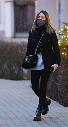 Na zakupowe szaleństwo Perfekcyjna ubrała się bardzo wygodnie. Wybrała bluzę, czarny płaszczyk, obcisłe spodnie i modne botki Patrizia Pepe za około 1300 złotych z podeszwami przypominającymi szczotki. Do tego dobrała torebkę Pinko za ponad 1600 złotych.