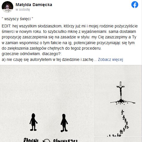 Hej wszystkim słodziaszkom, którzy już mi i mojej rodzinie pożyczyliście śmierci w nowym roku. To szybciutko mknę z wyjaśnieniami. Sama dostałam propozycję zaszczepienia się na zasadzie w stylu: my Cię zaszczepimy, a Ty w zamian wspomnisz o tym fakcie na instagramie, potencjalnie przyczyniając się tym do zwiększenia zastępów chętnych do tegoż procederu. Grzecznie odmówiłam. Dlaczego?