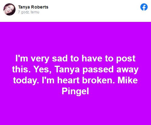 O śmierci aktorki poinformował za pośrednictwem profilu Tanya w mediach społecznościowych jej agent Mike Pingel.