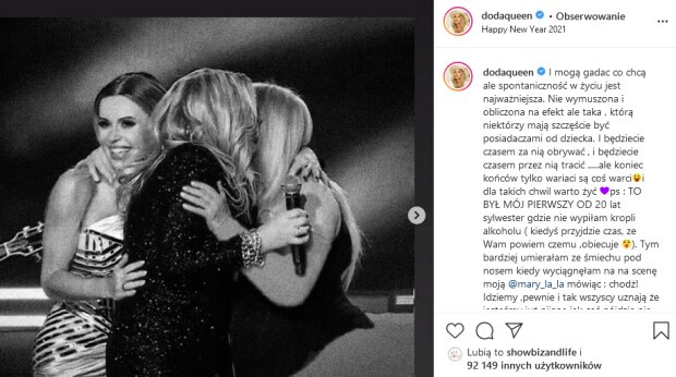 W ostatnia noc roku Doda na swoim profilu społecznościowym poinformowała, że to pierwszy sylwester bez odrobiny alkoholu. Obiecała fanom, że kiedys im opowie dlaczego nie wypiła ani kropli alkoholu w tym dniu.