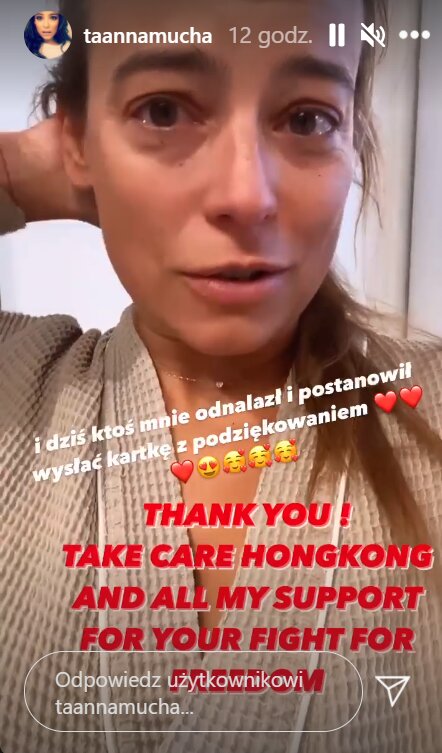 Aktorka nie wykazała się w tej sprawie totalną obojętnością, jak mogłoby to zrobić wiele turystów. Zamiast tego, Anna Mucha wykorzystała swoje zasięgi i relacjonowała to, co sie dzieję w Hongkongu na swoich social-mediach. W tej sprawie udzieliła nawet wywiadu Polsat News.