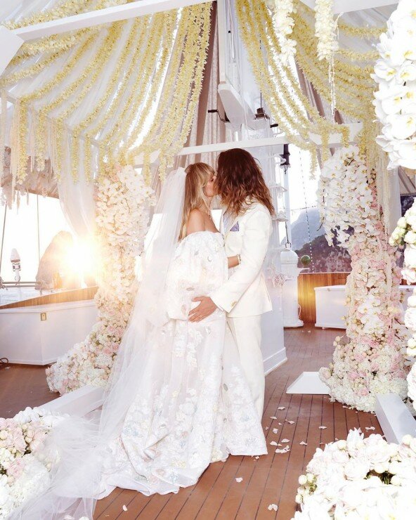 Małżeństwo byli razem ubrani w białe kostiumy. Heidi miała na sobie biały długi welon, a sukienka miała styl z odkrytymi ramionami.