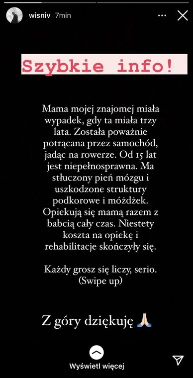 Mama mojej znajomej miała wypadek, gdy ta miała trzy lata. Została poważnie potrącona przez samochód, jadąc na rowerze. Od 15 lat jest niepełnosprawna. Ma stłuczony pień mózgu i uszkodzone struktury podkorowe i móżdżek