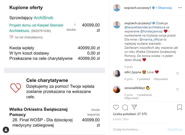 "Dziękuję @karpielsteindel.architektura za wspieranie @fundacjawosp i wystawienie na licytacje swojej pracy! Dla mnie i @marina_official to najlepiej wydane pieniążki”- czytamy pod screenem z dowodem wpłaty.