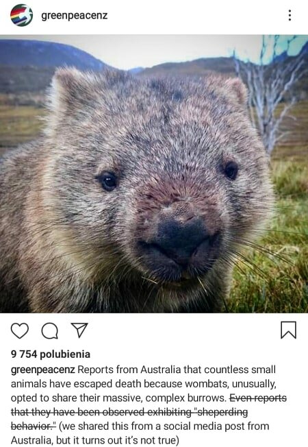 Jednak okazuje się, że nie tylko człowiek próbuje pomagać. Greenpeace zauważyło, że wombaty, które naturalnie żyją w norkach, pomagały drobnym zwierzakom uciec przed zagładą i „zwierzęcym języku” zapraszały je do swoich głębokich dziur pod ziemią.