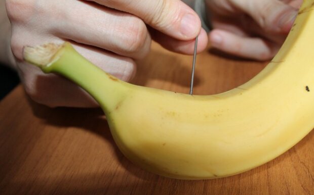 Wystarczy wbić igłę w owoc, zaczynając od jego górnej strony. Następnie przesunąć od lewej do prawej przez wnętrze jeszcze nieobranego banana. Należy powtarzać tę czynność, wykonując ją coraz niżej, aż do dolnej części owocu.