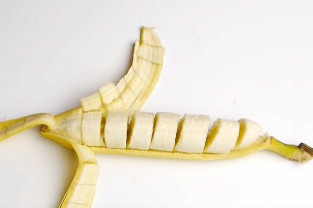 Gdy skórka obierze od banana, zobaczymy jak pięknie baban jest pokrojony w plasterki. Jesteś zdziwiony, a ty spróbuj!