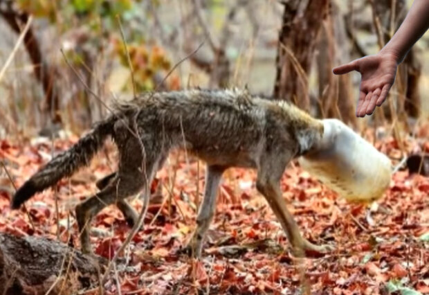 Im okazał się wilk. Wyglądał strasznie. Cały chudy, brudny. Na swojej głowie miał plastikowy słoik. Zwierze bardzo męczyło. Plastikowa butelka całkowicie otoczyła głowę wilka, co utrudniało mu oddychanie. Ponadto nie mógł także jeść, co można było zobaczyć na jego ciele, widoczne były tylko kości.