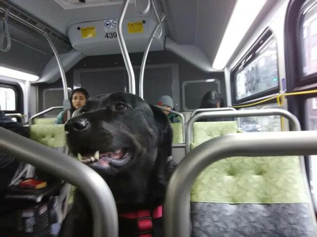Eclipse nie jeździ na gapę. Jego właścicielka zapewnia, że przepustkę autobusową ma przyczepioną do kołnierza. Wszystko jest zgodnie z zasadami.