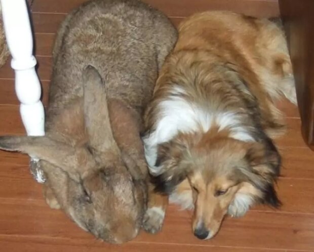 Królik flamandzki, którego rozmiar osiągnął 1,3 metra. Na jego tle zagubił się nawet duży pies.