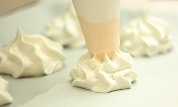 Następnie obracamy mikser na maksymalne obroty i po 3 minutach otrzymujemy gotową, piękną masę z ptasiego mleczka. Natychmiast rozprowadź ją porcja po porcji (użyłam woreczka do ciasta, aby pianki były piękne) na blasze do pieczenia wyłożonej pergaminem.