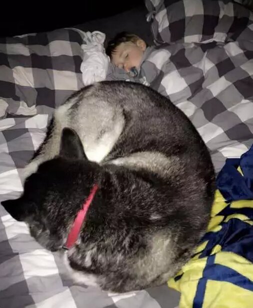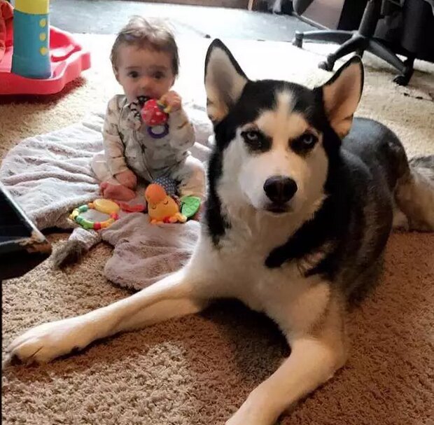 Boston jest rasy Husky i wydawać by się mogło, że nie będzie zadowolony zabawą z bobasem. Nic bardziej mylnego! Od samych narodzin chłopczyka, piesek nie spuszczał go z oczu.