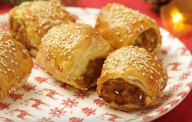 Na rozgrzanej patelni z oliwą z oliwek podsmaż posiekanego pora i papryczkę chili. Mięso przełóż do miski, dodaj dwa jaja, bułkę tartą, curry, paprykę, podsmażone wcześniej składniki. Dokładnie połącz wszystkie składniki. Rozmrożone ciasto francuskie przekrój wzdłuż na dwa paski i posmaruj pozostałym, roztrzepanym jajkiem. Na dłuższym boku paska rozłóż farsz, zawiń ciasno ciasto. Otrzymaną roladkę pokrój na kawałki o długości około 4 cm. Wyłóż blachę do pieczenia pergaminem i ułóż paszteciki. Następnie posmaruj je jajkiem i posyp ziarnami sezamu. Piecz w piekarniku rozgrzanym do 190 °C przez 15-20 minut.