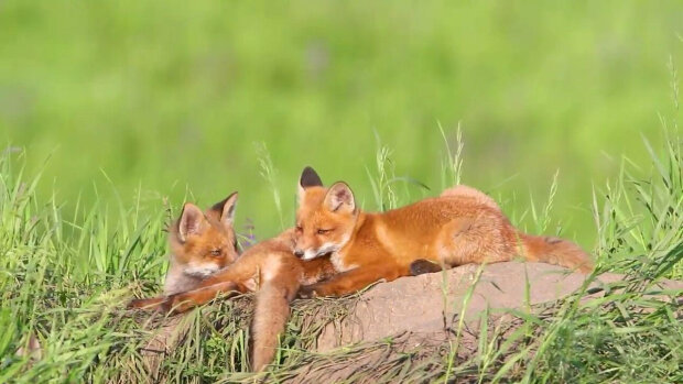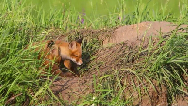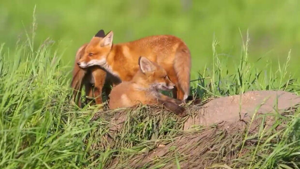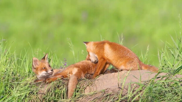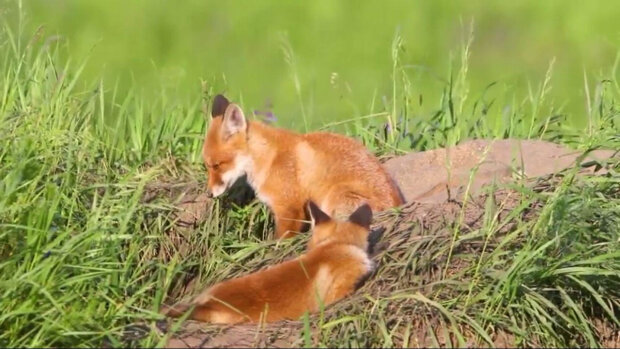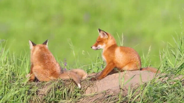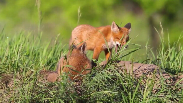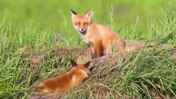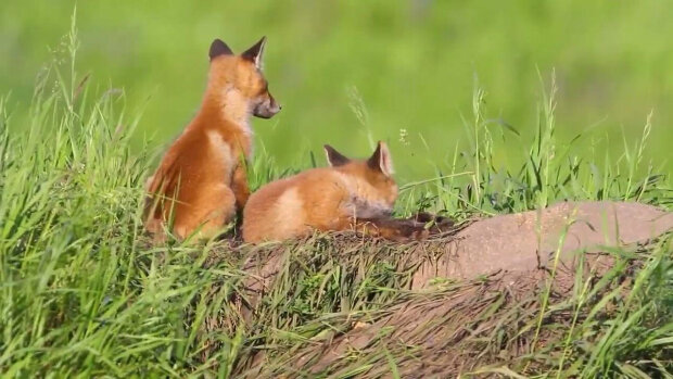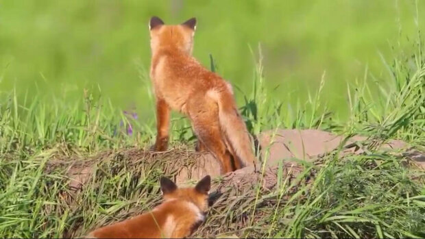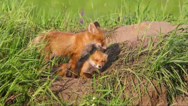 Na zdjęciu młode lisy wyrosły, bawią się i obserwują wszystko, co dzieje się poza dziurą.
