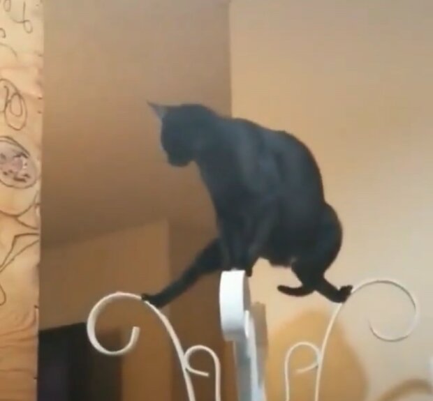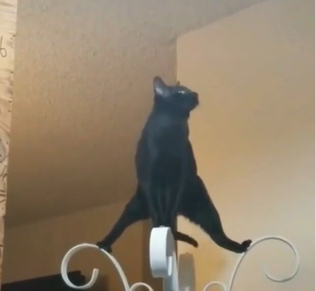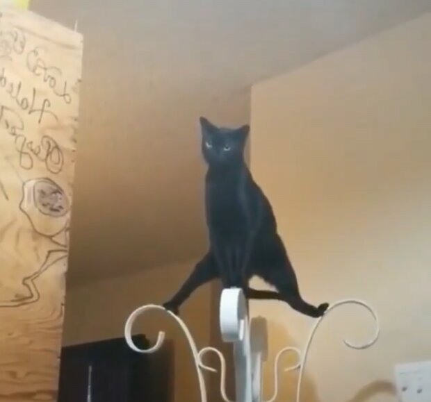 Na tym filmiku kot spokojnie wspina się na wieszak i robi szpagat. Najwyraźniej nie było mu zbyt wygodnie, ale i tak kontynuował demonstrować swoja gibkość w całej okazałości.