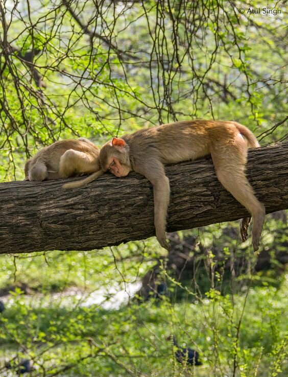 W nocy układają sobie coś w rodzaju łóżka z liści, trawy lub gałązek i zwijają się w tych „gniazdach” jak ludzie w ciepłym łóżku. Małe małpy, takie jak małpy lub makaki, śpią inaczej, po prostu zamarzają, siedząc na gałęzi w wygodniejszej pozycji, poruszają się we śnie i od czasu do czasu budzą się, aby sprawdzić, czy w pobliżu nie ma drapieżników.
